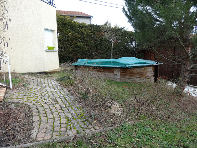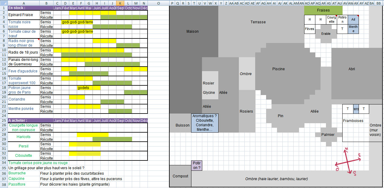 Je viens chercher votre avis sur un projet de potager que j'ai pensé pour mon jardin. Je suis en location dans les monts du Lyonnais et la petite parcelle de jardin est à mon sens très mal pensée. Ci-dessous le plan, et les photos... Il y a donc en plein milieu et n'importe où : une piscine, un abri de jardin, quelques espèces locales d'arbre (pin et palmier...), des rosiers et une grande terrasse, le tout entouré d'une haie très haute qui fait beaucoup d'ombre à ce qui reste de pelouse. En blanc, les parcelles "disponibles".