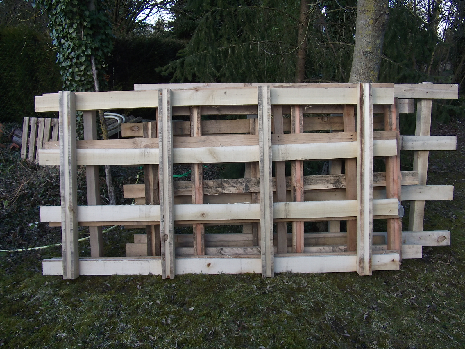 Les dernières palettes démontées. Tout n'y est pas mais le reste, principalement des traverses, est en vrac dans un coin.