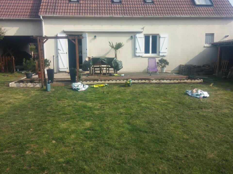 Voila j ai une terrasse en composite de 8mètre de long et 3,50 de largeur,accolé à la maison....entre la terrasse et la pelouse,il y a une plate bande de 50 cm de largeur qui est délimite pour une bordure.avant il y Avait des lavandes mais très moche ainsi que des bacs mais qui était en très mauvais etats,donc j ai tout retirer,retourner la terre et installer une bordure.