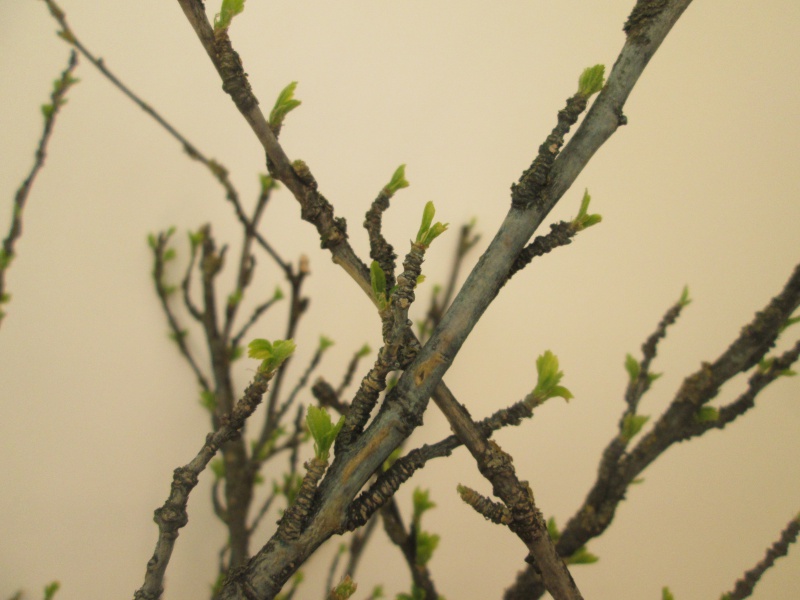 Ses branches sont très foncées, ont un aspect de vieil arbre d'ailleurs, il y en a une qui est un peu bleutée (visible sur la 4e photo).