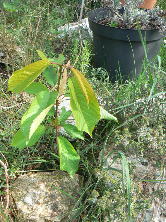 Bien, je suis retourné le voir de plus près et je pencherais effectivement plus pour un cerisier que châtaigner, d'autan qu'il y en a un très proche. Quoi qu'il en soit je vais le déterrer et le mettre en pot ce qui me laissera le temps de savoir et comprendre ce qu’il faut faire pour avoir des cerises.