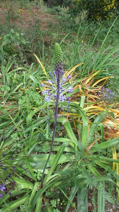 A côté de plusieurs scilles du Pérou, et semblant sortir du même genre de feuilles, j'observe la plante en photo qui commence sa floraison.