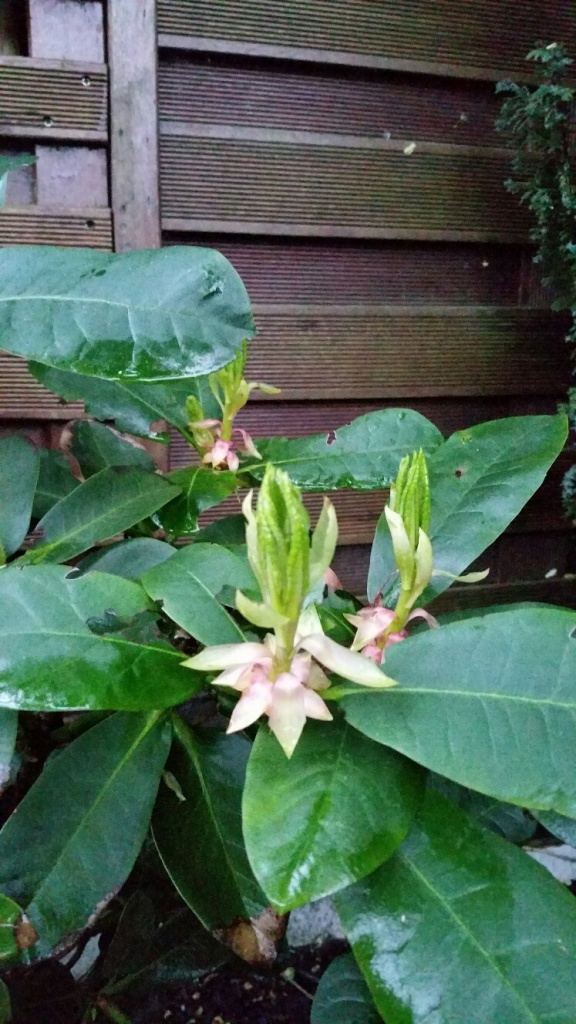 L'année passée un ami m'a offert un rhododendron avec de belles fleurs roses. Je l'ai planté dans le jardin a coté d'une sorte de cyprès. Il est dans un endroit ombragé et j'ai bien veillé à le planter dans la terre de bruyère.
