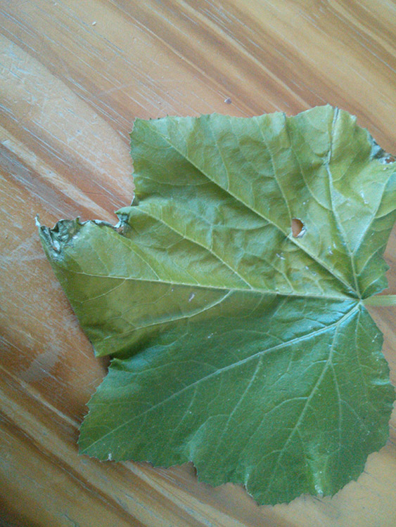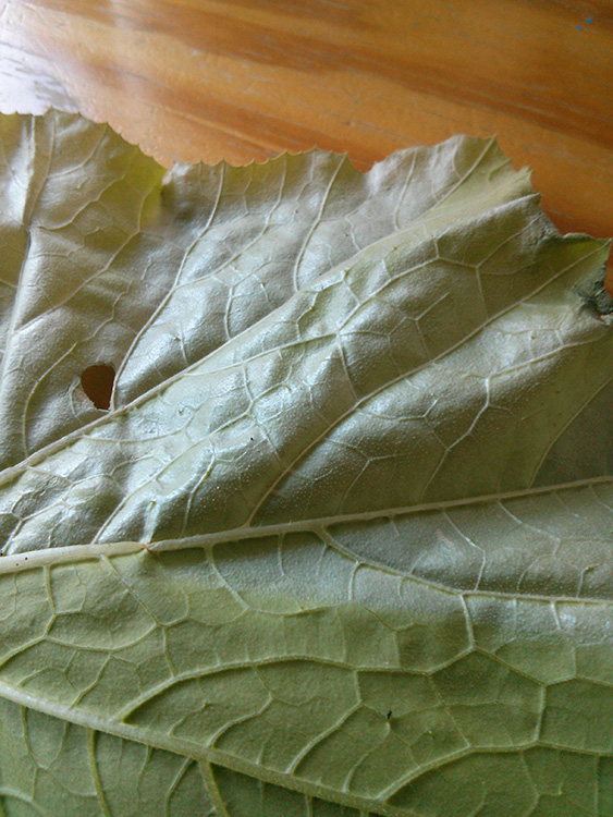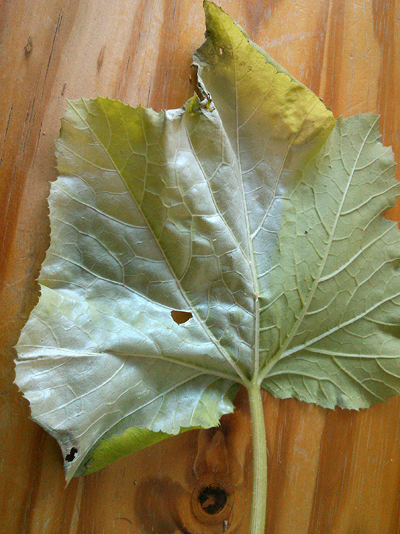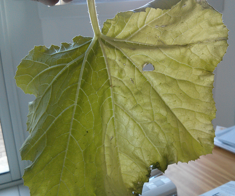 La moitié de la feuille semble sans vigueur, commençant à se flétrir au bout et surtout, sur l'envers, est argentée. Quand on tient la feuille à la lumière, la zone semble plus fine. Au toucher, la feuille est souple, elle n'a pas l'air sèche.