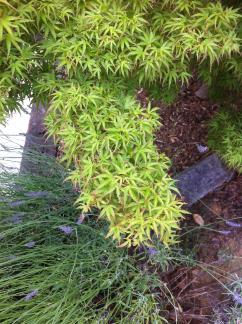 Fin mai il est bien sur un peu tôt pour qu'un Acer perde ses feuilles ; ici il y a eu 10 jours de vent et trois pluies de 10mm chacune et bien j'ai des terminaisons recroquevillées sur katsura , j'ai donc arrosé un peu plus et j'ai pincé les terminaisons aujourd'hui.