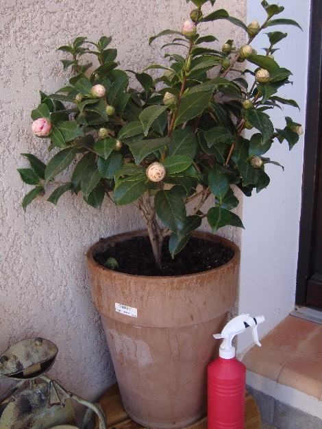 En fait je t'explique l'histoire de mon camélia. Je l'ai acheté il y a un mois en jardinerie plein de boutons et même une fleur bien ouverte. En arrivant chez moi , j´ ai trempé les racines avant de le mettre dans un pot plus grand ( c'est pourquoi je dis que je l'ai rempoté)avec un mélange de moitié terre de bruyère et moitié bon terreau. Il est placé sur une terrasse couverte avec juste 1 heure ou 2 de soleil dans la journée vers 10 heures le matin et il est à l'abri du vent fort.
