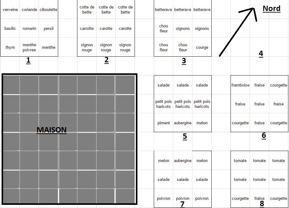 2-avons nous bien mis notre potager ?, comme vous pouvez le constater pas tous les carrées n'ont le meme ensoleillement... effectivement tous les carrée on le soleil dés le levé par contre les carrées 1 et 2 sont a l'ombre de la maison des 13h il me semble alors que le 6 et 8 ont le soleil jusqu'a 19h environs, du coup nous avons privilegier le carrée 1 pour les herbes aromatique alors que le 6 et 8 pour les tomates et les fraises...