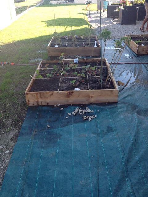 1-avons nous bien fais notre potager? nous avons mis un geotextile anti mauvaise herbes, par la suite entre les carrée nous metterons des dalles, nous avons laisser 80 cm entre les carrées.