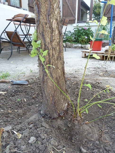 Les rejets sont une conséquence de la maladie du bois, la sève a du mal à monter, d'ou mise à fruits et rejets depuis les racines au pied ; il faut les couper dès qu'il y en a.