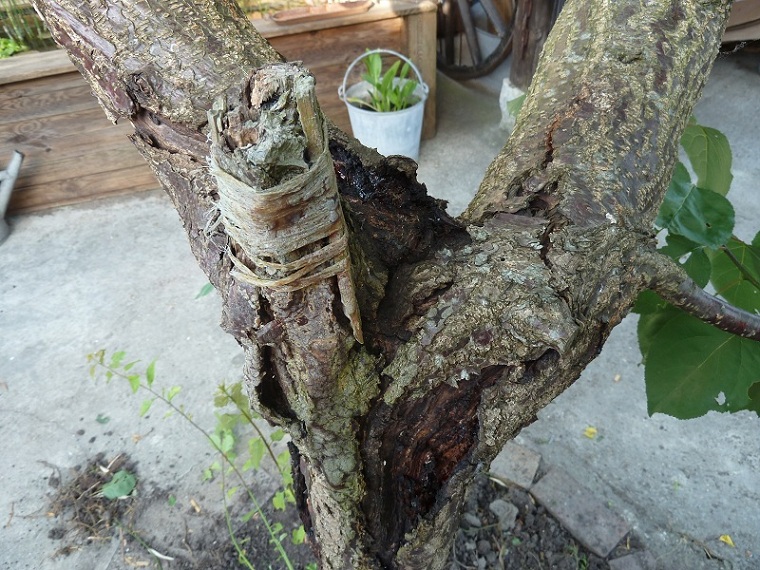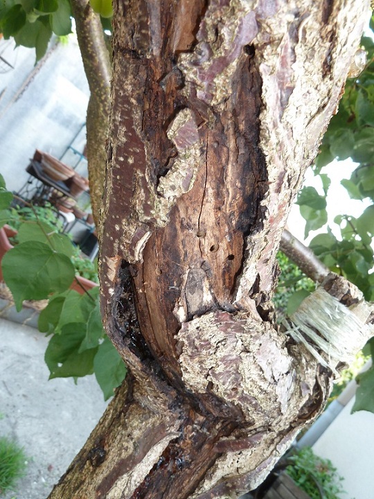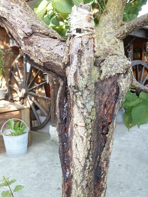 Ton Abricotier se bat contre une Bactériose. Le bois du tronc présente des chancres bactériens typiques.