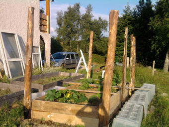 Voici l'étape n°2 : on a posé 2 planches sur les piquets qui soutiendront le toit