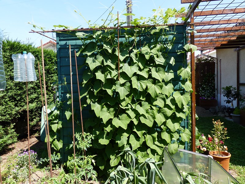 Chez moi, comme Aygues l'avait prévu, les lianes sont exubérantes, la cabane de jardin est totalement recouverte et quelques belles chayottes pendent déjà du support.
