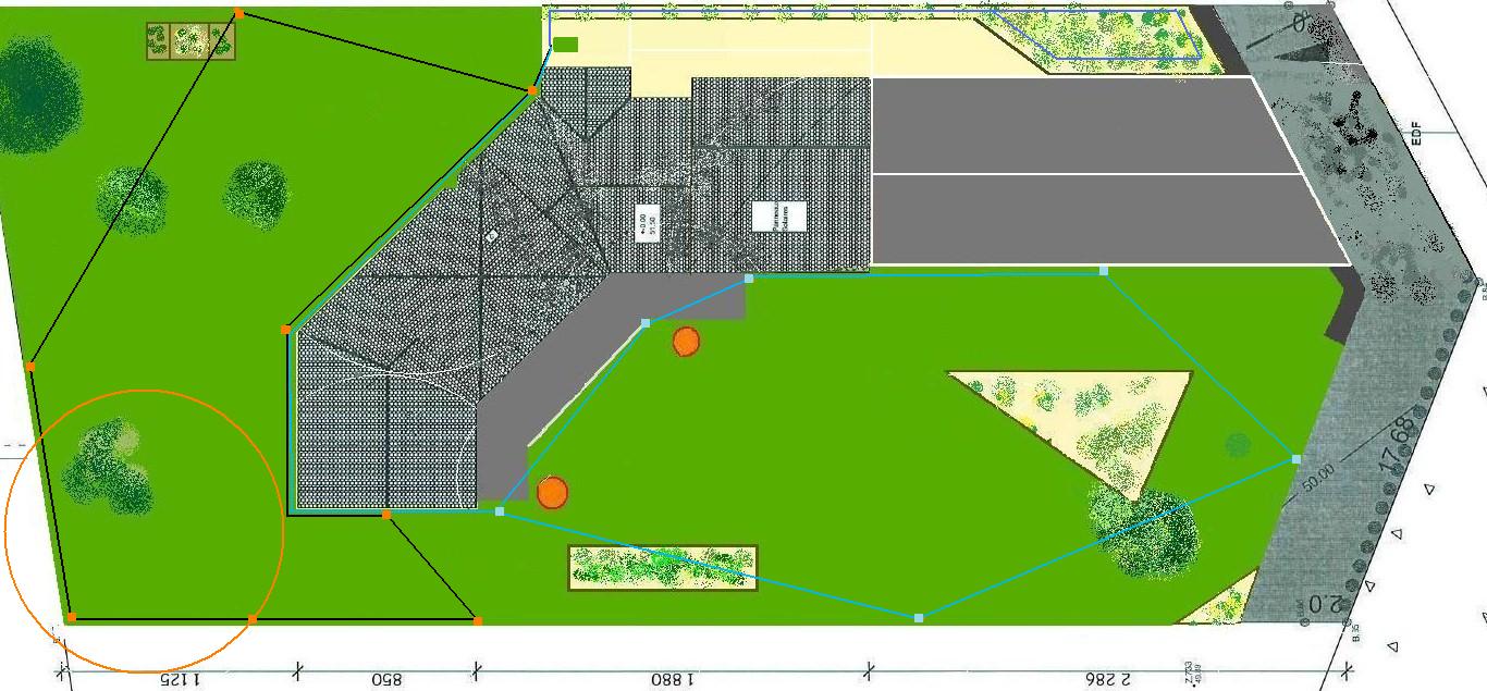 J'ai dessiné sur un plan de masse l'emplacement des futurs turbines et des réseaux (3) et simulé avec un compas l'arrosage du terrain.