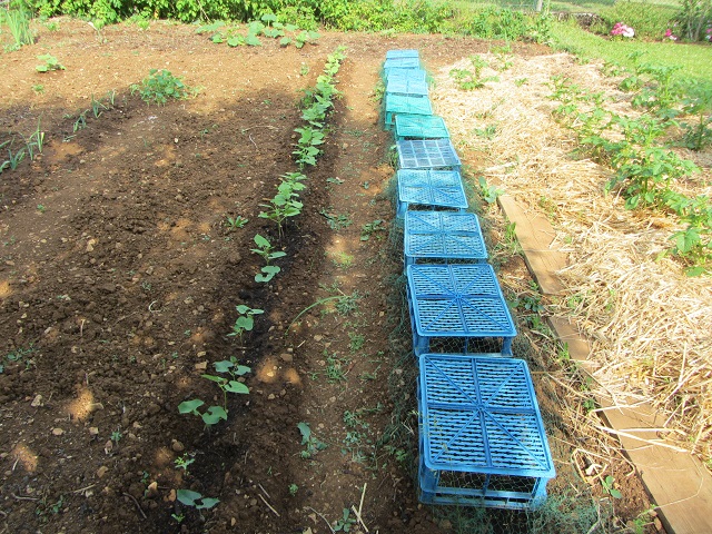 Samedi, j'ai posé le filet sur un rang de haricots que je venais de semer, car sans filet, je ne donne pas cher de mes haricots quand ils vont germer. Les cageots sont plus faciles à installer, mais comme je suis maintenant obligée de les encapuchonner avec les filets, depuis qu'ils ont trouvé la porte d'entrée, c'est double boulot.