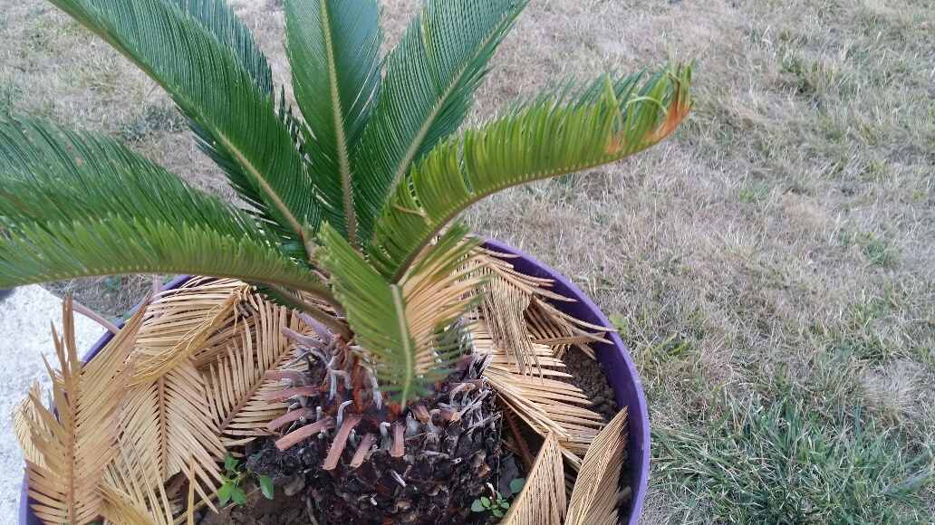 j'ai 2 cycas revolutas comme le tiens qui reviennent de loin puisqu'ils avaient pris le gel (suite à un mauvais entretient de ma part car on m'avait mal conseillé..), je les ai en pot au soleil, je les arrose modérément 2 à 3 fois par semaine, uniquement le soir, et ils se portent bien.si des feuilles sèchent personnellement je les couperais au ras de l'"ananas".. mais cela n'engage que moi..