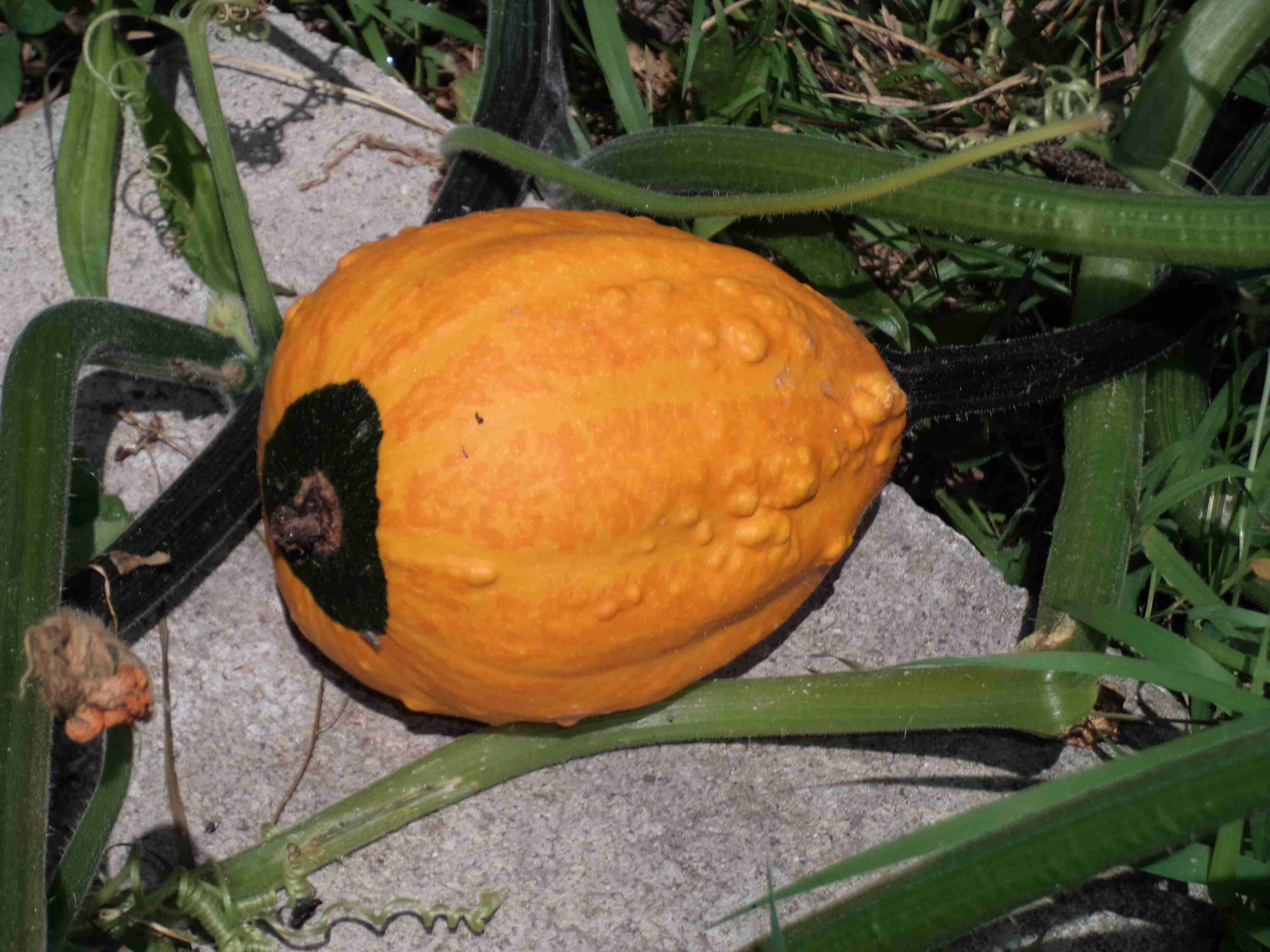 Si j'arrive en général à identifier la variété, ce n'est pas toujours le cas, comme celle-ci, qui fait environ 10 cm de long, jaune avec l'extrémité verte, légèrement verruqueuse (coloquinte ?).