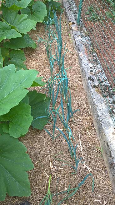 - Les poireaux plantés peu de temps après les courgettes,se développent également bien,il sont un peu étouffés par les courgettes,mais ce n'est pas gênant car avant l'hiver ces poireaux seront arrachés pour être replantés dans le tunnel ce qui permettra de les arracher même par grand froid.