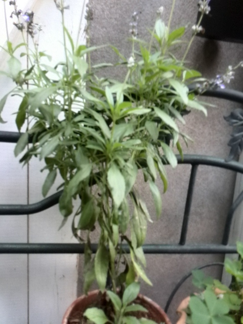 Dommage, la photo est un peu floue, cela pourrait faire penser à une sauge,si tu pouvais nous donner la couleur de la fleur? la hauteur? depuis combien de temps est-elle en pot? l'arrosage?