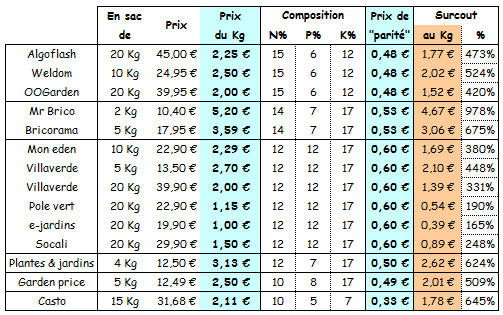 - ...............Le "surcoût" est le résultat de la comparaison de ces prix (hors frais de port !) avec des engrais
