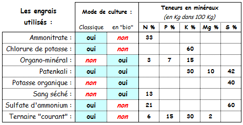 Pour être concret et pouvoir calculer les apports effectifs de minéraux, je n'ai retenu que quelques engrais qui sont les suivants :
