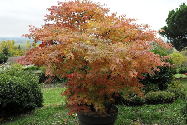 Un Erable jeune ne produit pas toutes les couleurs dont il est capable, il faut plusieurs années. J'ai le palmatum ci-dessus depuis 12 ans + 2 pour la greffe + 2 pour le porte-greffe.