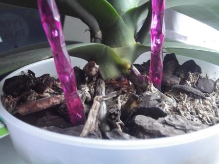 Voici ma belle surprise, l'orchidée a 4 hampes florales de ma collègue se portent comme un charme... Après le rempotage, me voila avec 4 futurs bébés hampes florales qui pointent leur bout de nez !