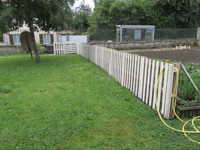 et là ma nouvelle barrière , l'autre était pourrie.des palettes récupérées sur un chantier, pas encore tout fini.