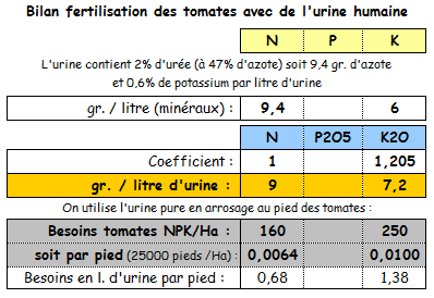 Avec 1 litre d'urine par pied de tomates, on couvrirait les besoins en azote de la plante. Il faudra couvrir les besoins en P et K.
