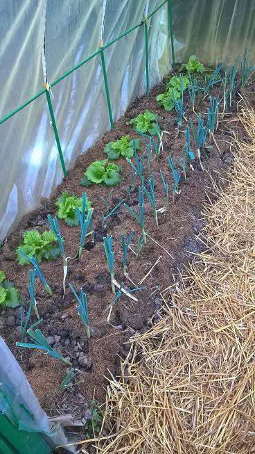 Les salades à coté des poireaux sont des batavias rouges grenobloise.Celles paillées de foins sont de gauche à droite:reine des glaces,lolo rossa puis sur le rangs de droite chicorées scarole au premier plan puis rouge grenobloise.