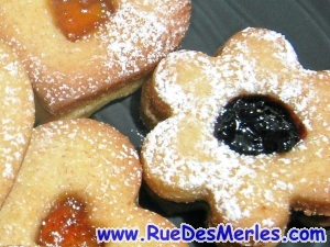 Badigeonner d'un peu de gelée de groseille ou framboise sur les disques entiers, saupoudrer les disques troués avec du sucre glace et les accoler aux disques de confiture.