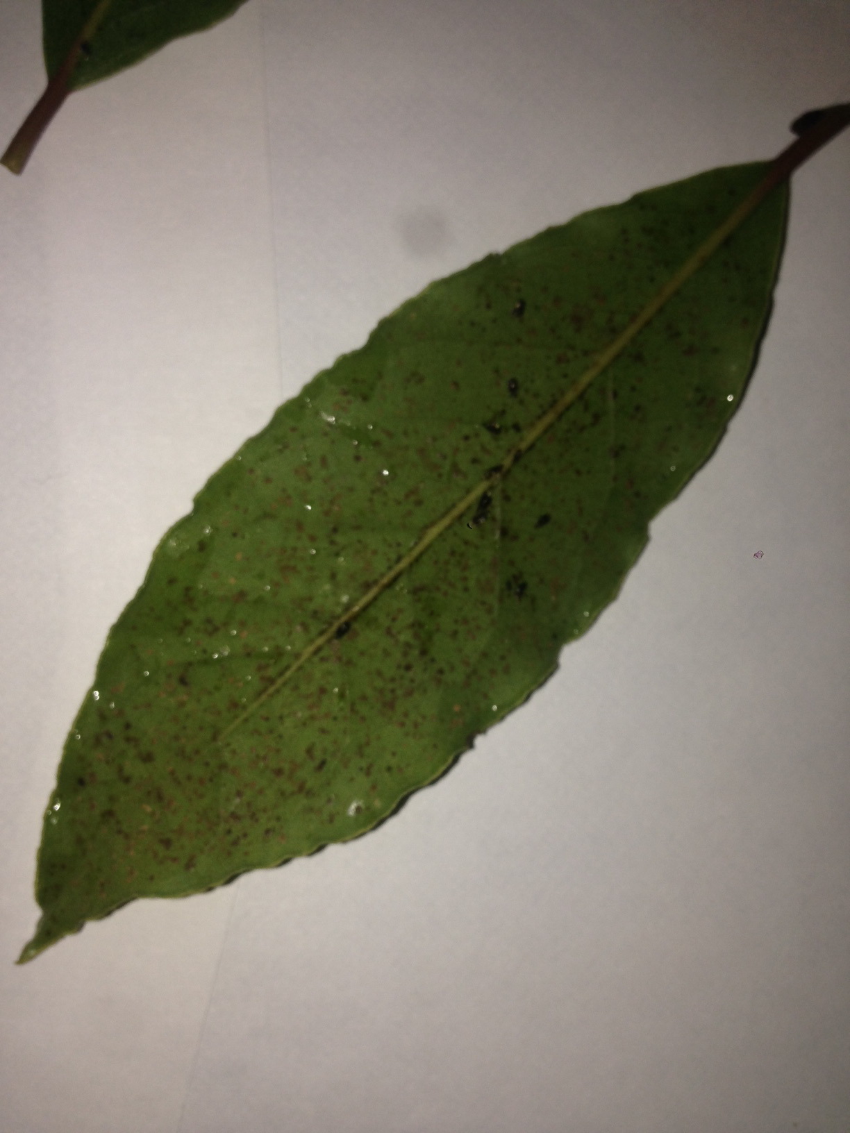 pour info, mon laurier est entouré par une haie d'ornement, Elaeagnus ebbingei , qui lui aussi est régulièrement malade, surtout l'été. Là les feuilles sont aussi piquées. Je les ai également traitées avec le même produit. en vain.