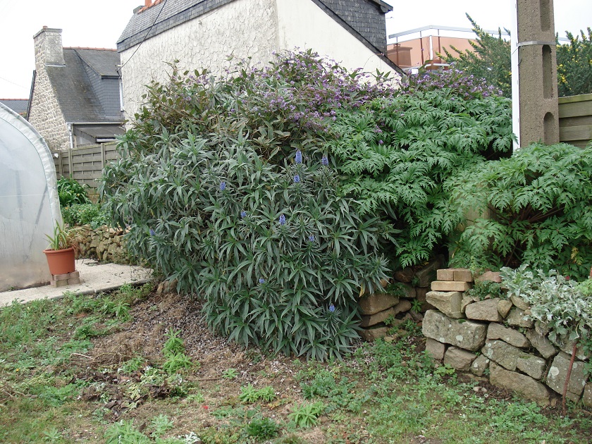 Un hardenbergia en fleur, un plant de vipérine de Madère et ses premère fleurs de la saison et quelques géraniums de Madère