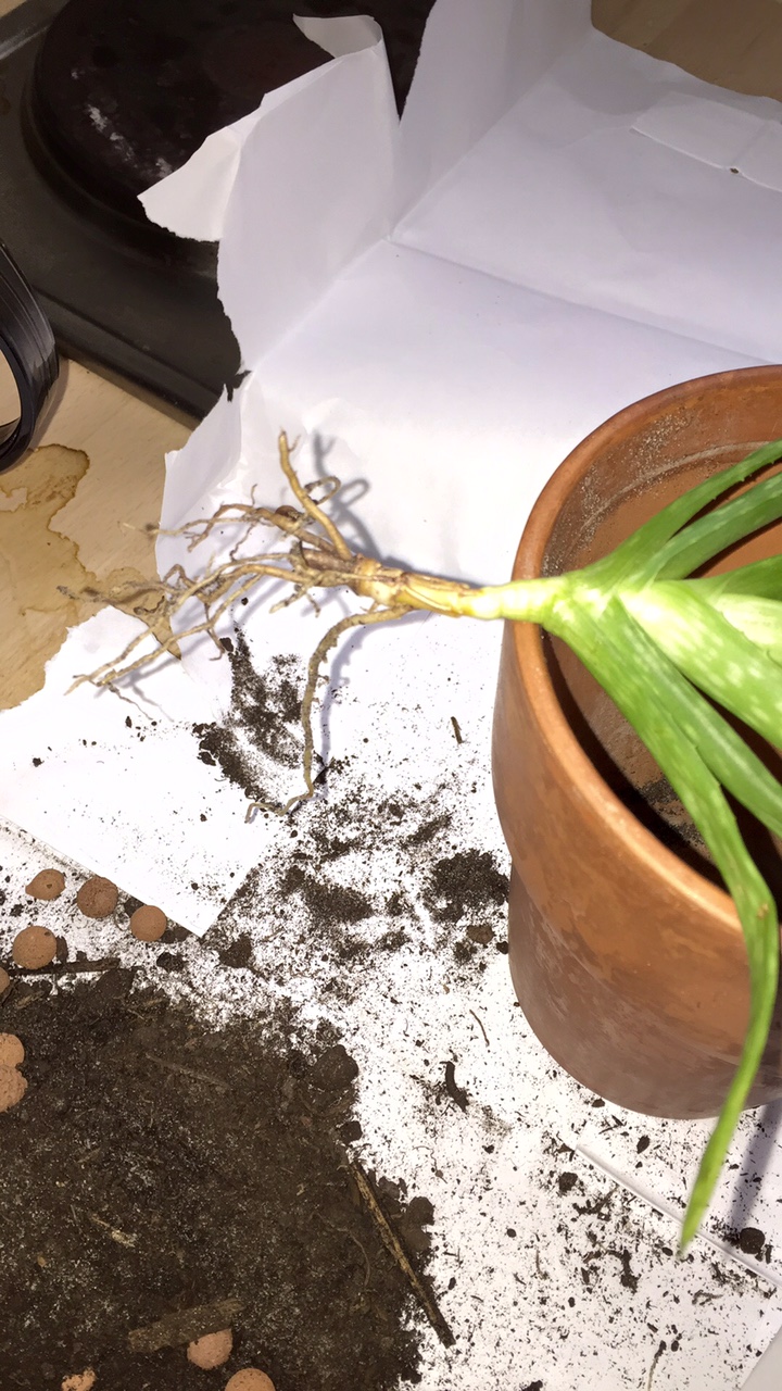 Après nettoyage j'ai mis un peu de cannelle et je laisse sécher avant de rempoter dans un pot mieux drainé avec un meilleur substrat.