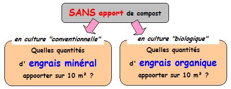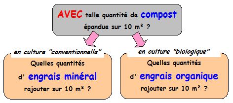 On en déduit, pour une palette d'engrais minéraux ou organiques "courants", ce qu'il faudrait apporter sur 10 m² de jardin en quantités de fertilisants soit en "culture conventionnelle", soit en "culture biologique".