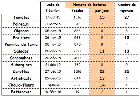Sur les 12 messages sur la fertilisation des légumes, les carottes ont été les plus lus et aussi les plus discutés, mais les tomates ont eu aussi leur succès. Cela correspond-t-il à la fréquence de leur culture ? ... étonnant pour les carottes pas toujours facile à réussir.