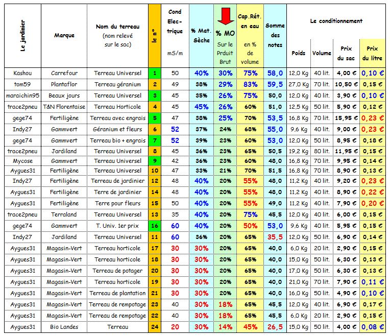 Autour de la note "45 à 50", on trouve 9 terreaux de "valeur analogue" ... on va de 12 à 23 cts ! du simple au double. Bref quelques économies possibles pour le milieu du tableau, soit pour des terreaux "moyens".