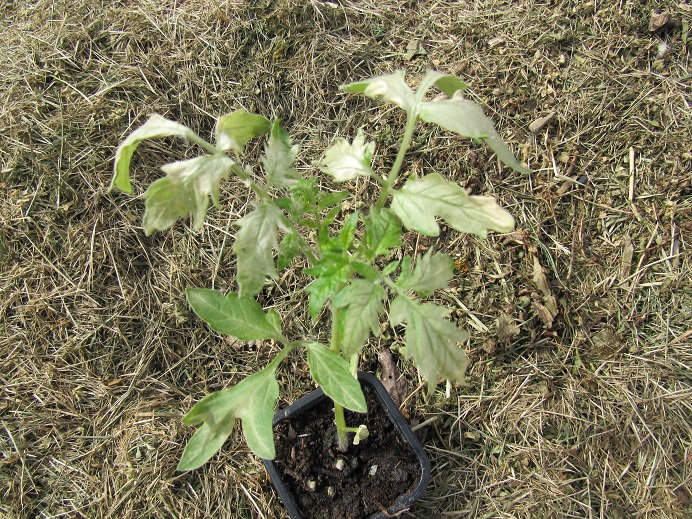 Vu la quantité de plants de tomates dont je dispose,j'ai fait l’essai il y a 2 jours de prendre un plant et de la placer avec son godet dans le jardin pour voir jusqu'à quel point il était capable de résister au gel.