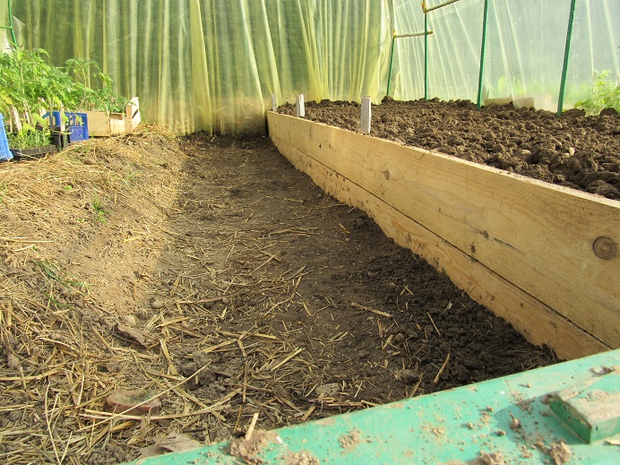 J'ai refait la planche de culture droite du tunnel en plaçant une bordure en bois.