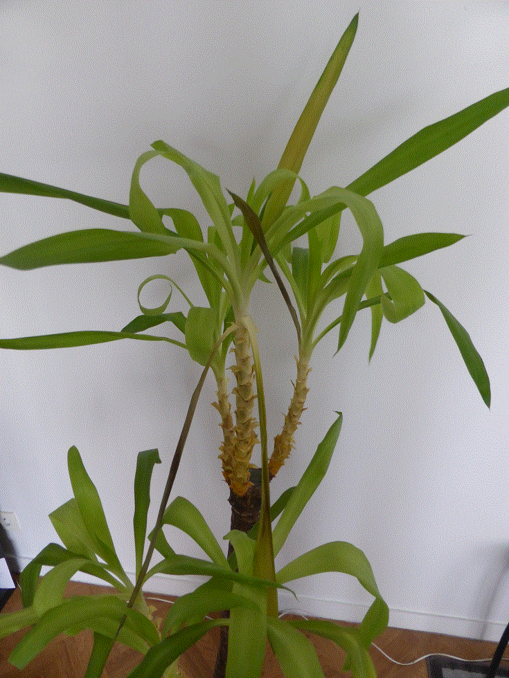 Egalement, une photo de la plante en entier où l'on peut voir que les petits troncs d'où partent les feuilles (de couleur jaune, je ne connais pas le terme) sont désormais très longs (jusqu'à plusieurs dizaines de cm) tandis que le tronc principal ne grossit pas.
