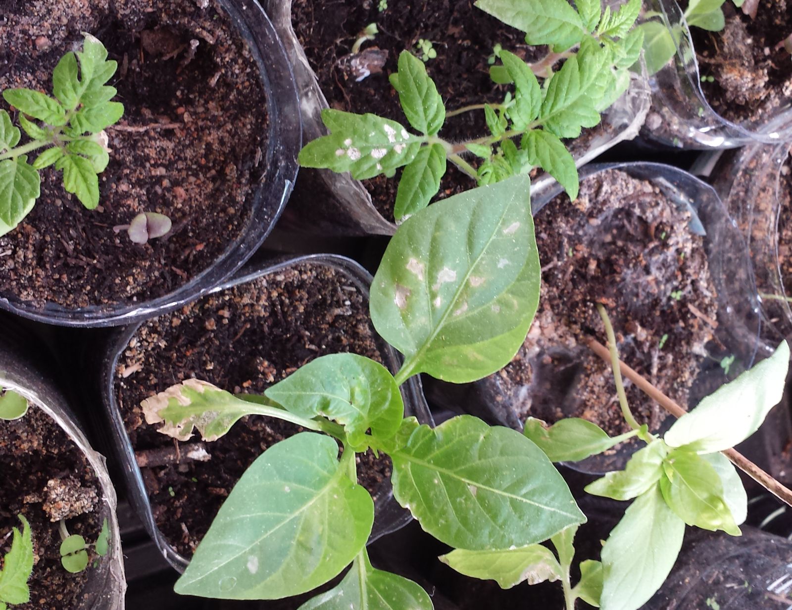 Je n'ai, à priori, pas constaté de point noir ou autre qui serait révélateur d'un parasite/insecte, mais dans le doute, une infusion d'ail (30g/l)+savon+bicarbonate a été pulvérisé. En tout cas, ça a eu l'air de stopper la prgression des tâches ur les poivrons !