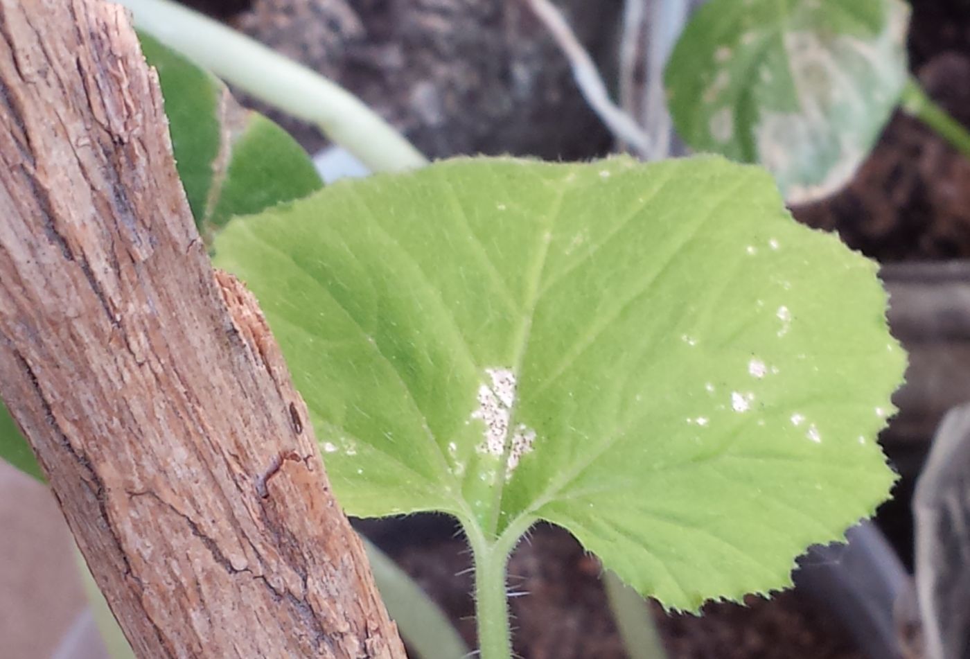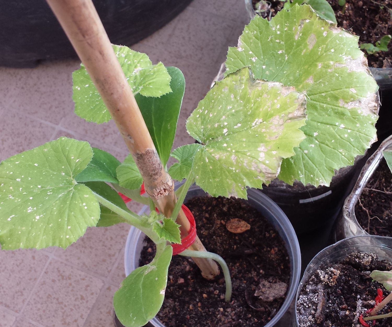 Et maintenant, les feuilles perdent leur belle couleur verte et se décolorent, surtout en bas du pied ! Et mes poivrons/piments se piquent de tâches brunâtres, et mes courgettes aussi, façon Voie Lactée !