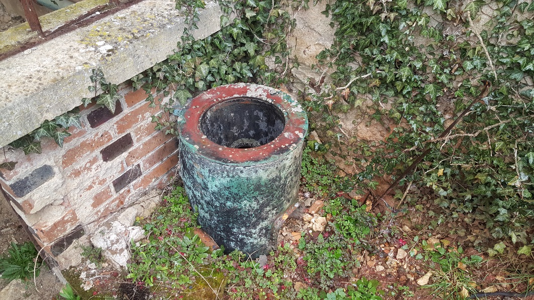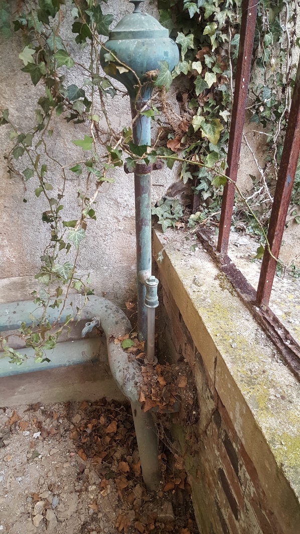 Il y avait un puis dans ce jardin et j'ai vu sur le mur au-dessus de la cuve les vestiges de supports pour un tuyaux du même format que ceux visibles sur les photos.