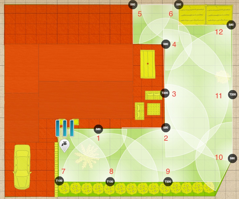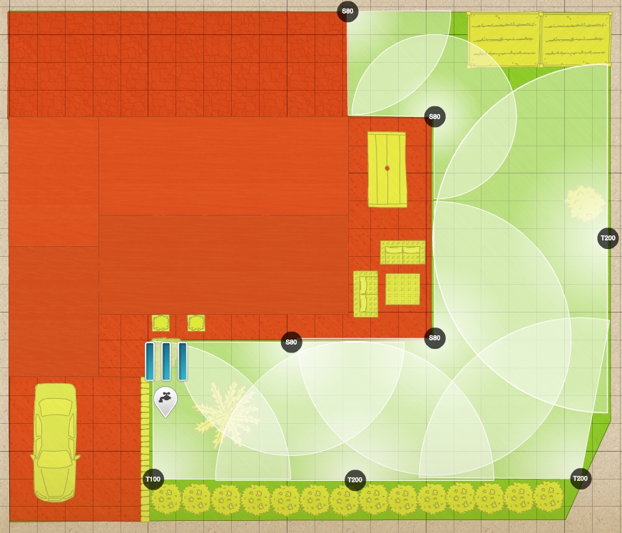 Il vous manque au moins 4 arroseurs : un en bas du plan (la turbine à 180° ne rejoint pas assez les autres arroseurs, il faut deux turbines), 2 arroseurs à 90° dans les angles vers le haut à droite (potager ?), un le long de la terrasse à 180° recoupant les deux autres et allant jusqu'à celui en face.