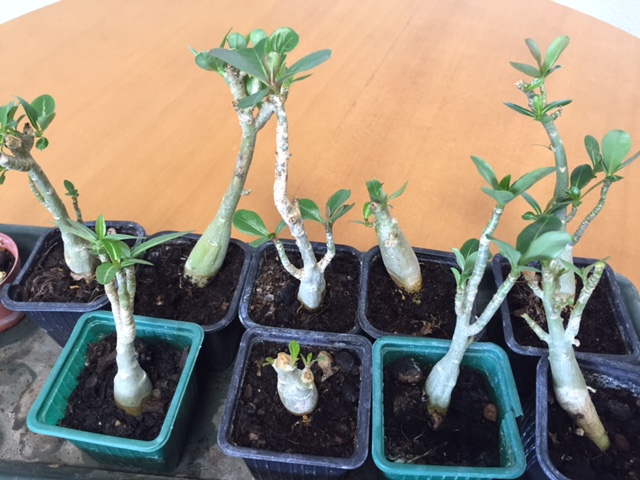 Il est possible que tes adeniums montent très haut aussi pour aller chercher la lumière, auquel cas essaie de les mettrent à l'endroit le plus lumineux possible quitte à les surélever pour qu'ils profitent le plus possible du soleil (y comprit d'une exposition direct). Attention aussi à l'arrosage, il faut laisser secher un peut la terre, surtout si ils manquent de soleil.
