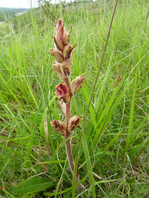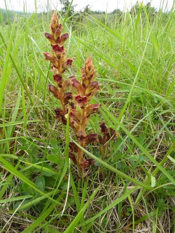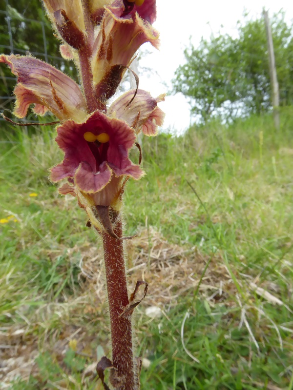 J'ai eu du mal à l'identifier, car elle ressemble à l'orchidée Neottie nid d'oiseau. Celle-ci est une petite orobanche (orobanche minor) Au début de leur croissance elles font penser à des champignons, ce sont comme eux des saprophytes, sans chlorophylle. Elles parasitent plusieurs plantes ; la classification est remise en cause car elles n'ont, semble-t-il, pas de plante préférée pour s'établir.
