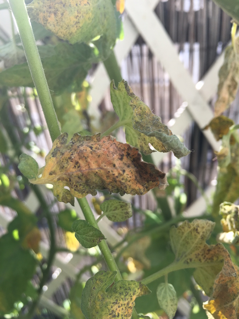 Les tiges n'ont pas l'air affectées mais toutes les feuilles sont petit à petit contaminées même après avoir enlevé la majorité des feuilles affectées. Les fruits n'ont pas l'air affectés.