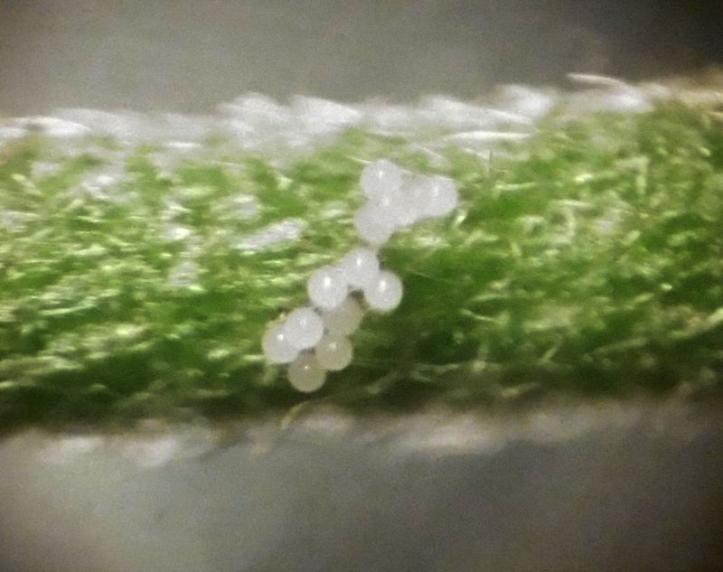 J'ai trouvé enfin ces poils étoilés mais difficile de faire une photo nette à travers la bino en *40... On devine quand même une étoile en dessous de ces billes qui sont en fait des pontes de je ne sais pas quoi. Je vous assure que en réalité il y a plein d'étoile ! Le champ de la photo fait moins de 5 / 10 ème de mm