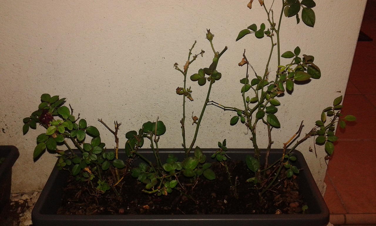 Les autres sont dans des petites jardinières et sont complètement déplumés. A part une ou deux roses, ils n'ont quasi pas fleuri et ne donnent pas de bourgeons. J'ai coupé les fleurs fanées et les rares tiges sèches mais c'est tout.