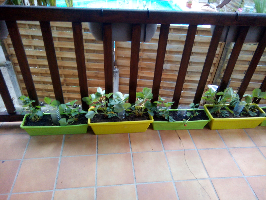 Je n'avais que des fraisiers malades en pleine terre mais sur ce balcon, tous mes fraisiers étaient magnifiques même si je n'ai pas encore eu beaucoup de fraises mais au moins c'était beau. sauf qu'à mon retour de vacances (seulement 1 semaine d'absence) 14 pieds de fraisiers on complètement grillé. Un désastre malgré les bouteilles dans les jardinières (voir photo) :cry: