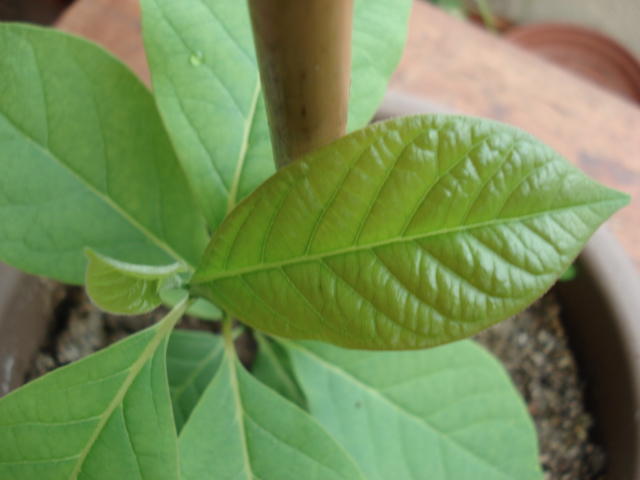 Non, ce ne peut pas être un avocatier : ls feuilles sont plu courtes et plus larges et surtout, cette plante n'est pas issue d'un noyau mais très certainement d'une graine qui s'est retrouvée dans le substrat. qui a une idée?